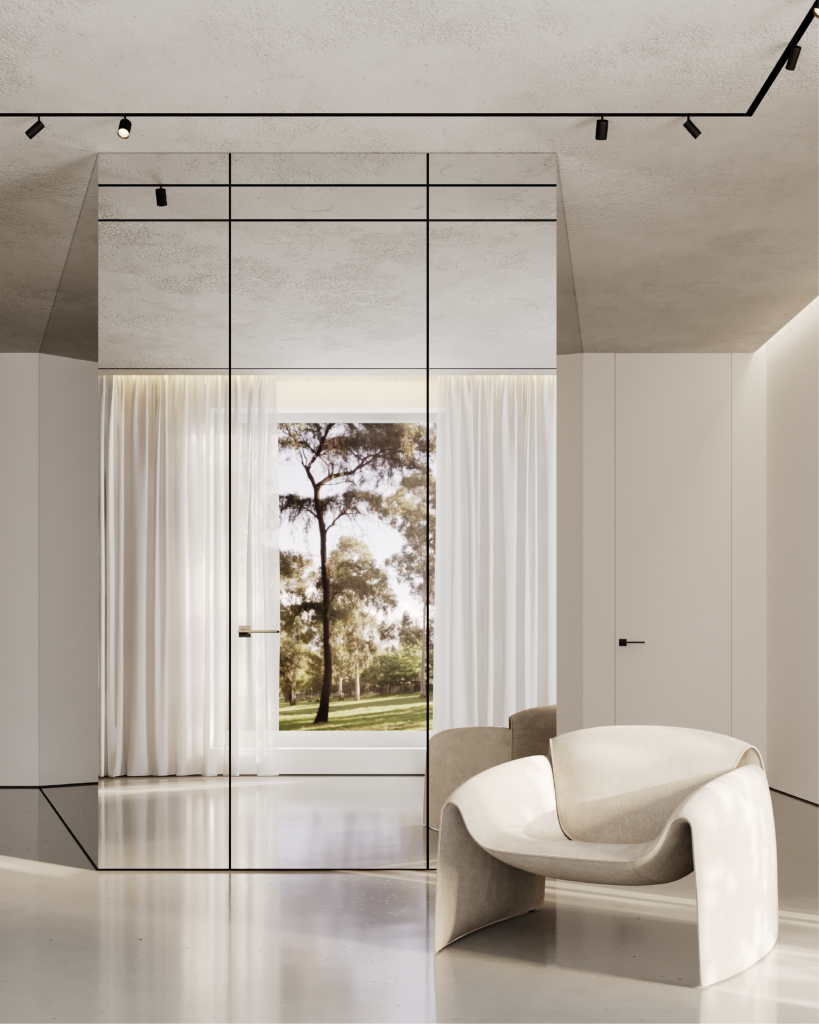 На рендере: зеркальные стеновые панели обрамляющие гардеробную + зеркальная дверь из коллекции Rain.
