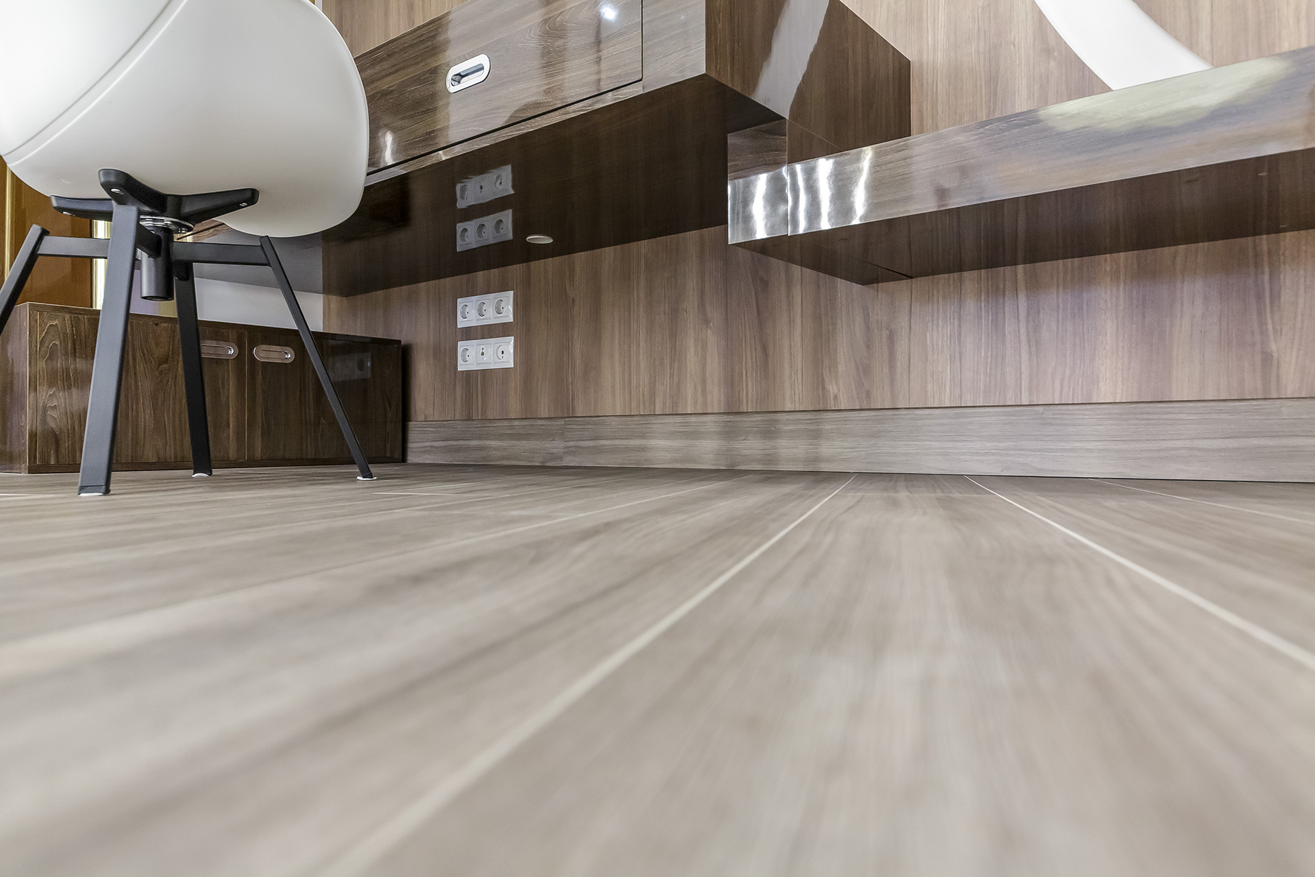 высотой 80 мм из PVC и 120 мм из МДФ с шириной по полу 16 мм. Плинтуса полностью соответствовали и мировому тренду, и выбранному стилю: современный и модерн, и уже не просто выполняли свою функцию – законченного интерьера, а стали претендовать на должность самостоятельного элемента декора. За счет сужения нижнего бортика у плинтуса фабрика Sofia достигла идеального результата: можно было свободно устанавливать любые сдвижные системы и ставить мебель к стене впритык. Так же у плинтуса на 120 мм из МДФ имеется специальный паз под кабель, который не меняет своей формы в отличие от большинства других кабель-каналов. Фабрика Sofia всегда уделяет особое внимание техническим и эстетическим характеристикам выпускаемого продукта. Плинтус — не исключение, тут нам удалось найти нужные пропорции сечения профиля, при котором: с одной стороны — создается визуальная иллюзия плоского плинтуса, идеально прилегающего к стене, а с другой стороны — обеспечивается технически необходимый размер ширины основания плинтуса. Он и гарантирует отсутствие зазоров между стеной и полом при использовании различных напольных покрытий, особенно всех видов