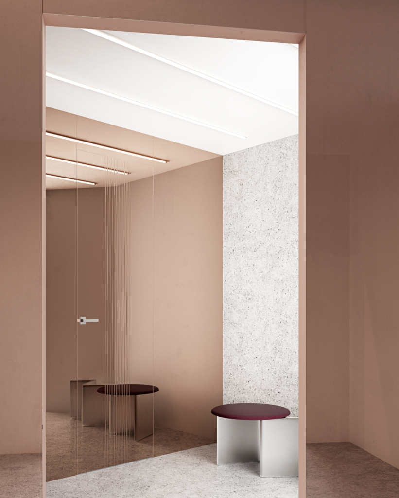 Попробуйте соединить стеновые панели со стеклом и двери из коллекции Rain.